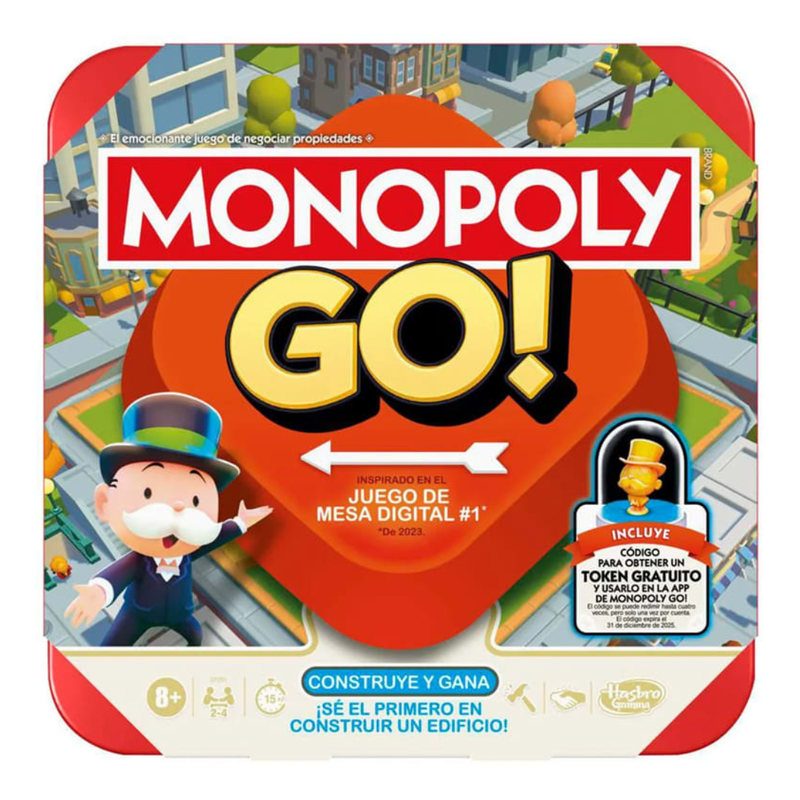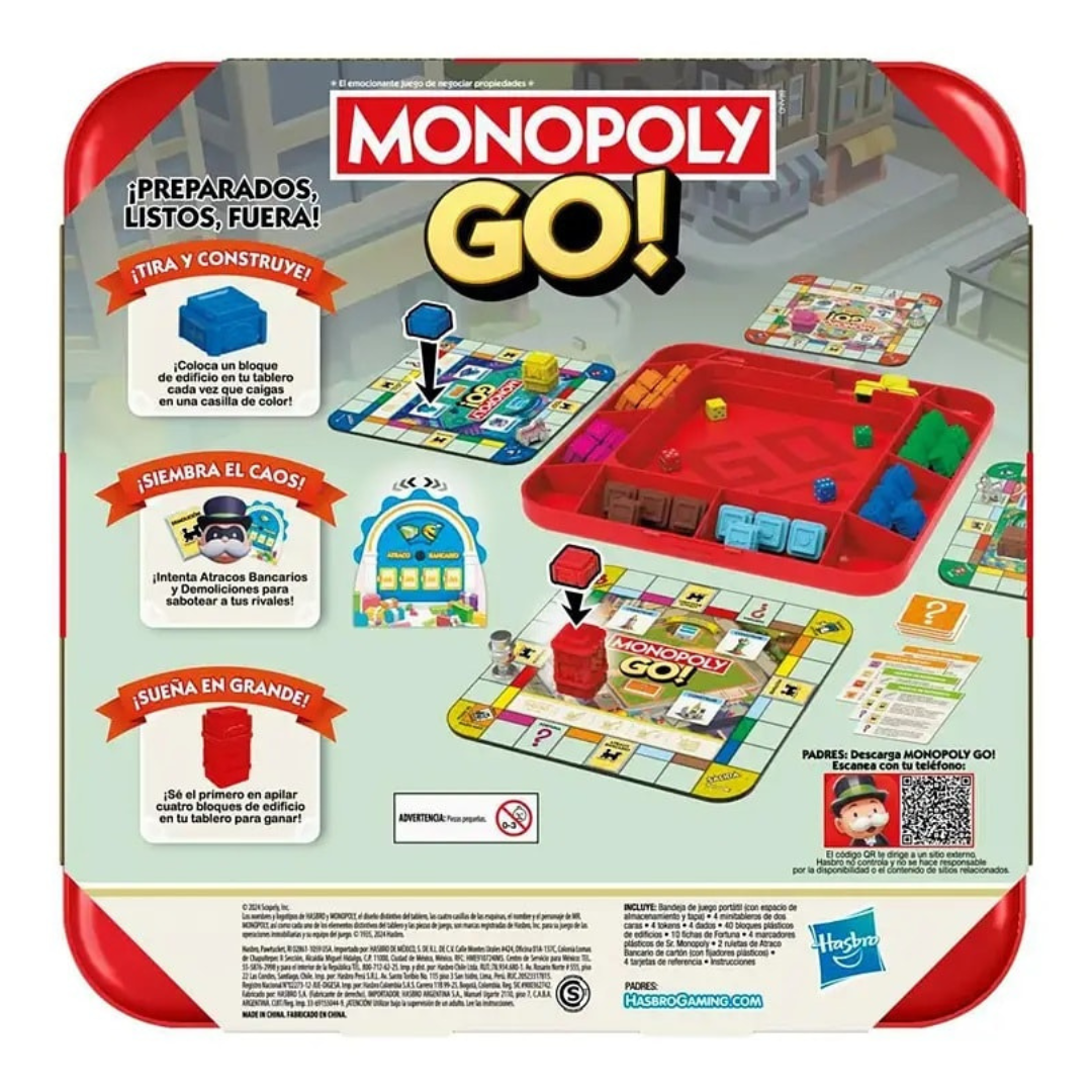 ¡El juego Monopoly GO! es lo que a los fanáticos les encanta del popular juego de aplicación móvil en una versión de mesa social! En este emocionante juego de mesa familiar, el primer jugador que construya un punto de referencia gana. Para comenzar, cada jugador elige un mini tablero con una ubicación favorita, además de un dado del mismo color. Luego, todos tiran su dado y avanzan esa cantidad de espacios alrededor de su tablero, ¡al mismo tiempo! Si un jugador cae en un espacio de color, toma un bloque de punto de referencia de la bandeja y lo agrega a su tablero. Usa Robos a bancos, Cierres y Mega Cierres para sabotear a los rivales. ¡El primero que apile 4 bloques de puntos de referencia del mismo color en su tablero gana! ¿Buscas juegos familiares divertidos para niños, adolescentes y adultos? Este juego de estrategia es una excelente opción para jugar en cualquier momento y es un regalo genial para niños de 8 años en adelante que aman los juegos de mesa Monopoly.
