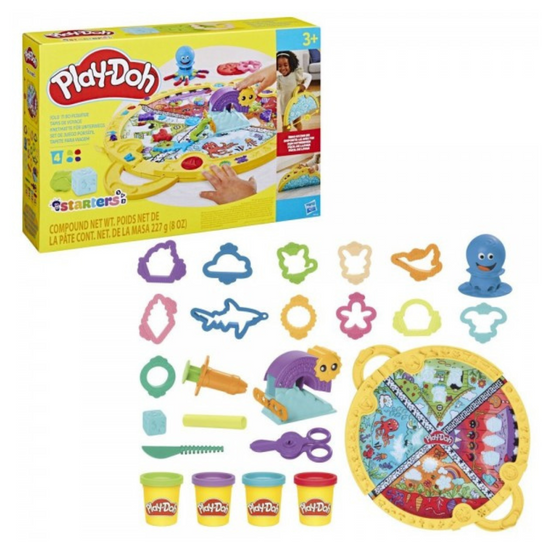 ¡Los niños podrán explorar su imaginación en casi todas partes con el Set de juego portátil! Este es el kit de inicio perfecto de la marca Play-Doh con su mantel de juego portátil, sus 19 accesorios Play-Doh y sus 4 colores blandos y maleables. El mantel de tela colorida inspira múltiples actividades creativas con divertidas herramientas que sellan, cortan y moldean la plastilina Play-Doh en muchas formas distintas. Mientras los niños crean y juegan, pueden explorar sus habilidades socioemocionales, su creatividad y divertidos temas como los animales. Es una gran adición a tus juguetes sensoriales tácticos y es un fantástico regalo creativo para niños y niñas a partir de 3 años.