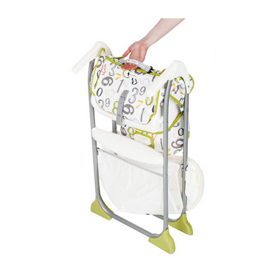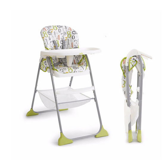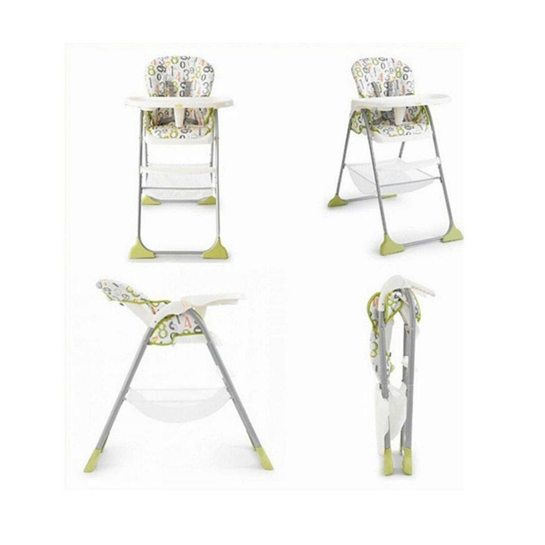 Practica silla de comer que ocupa muy poco espacio y cuenta con un plegado muy compacto. Se pliega muy rápido con una mano tirando de la correa ubicada en el centro del asiento. Se mantiene de pie una vez plegada. Extremadamente compacta una vez plegada. Almacenaje de la bandeja en la parte trasera. Gran bandeja ajustable en 3 posiciones con posavasos. Asiento reclinable en 3 posiciones. Gran cesta de almacenaje en la parte inferior. Su tapiz es desmontable y lavable. Incluye un util y seguro arnès de 5 puntos . Uso recomendado de 6 meses a 15 kg.
