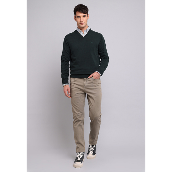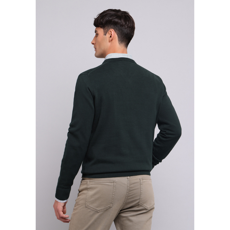 Sweater diseño liso, manga larga, cuello en V, regular fit, logo bordado a la altura del pecho, cuello-pretina-puños tejido acanalado, 100% algodón.