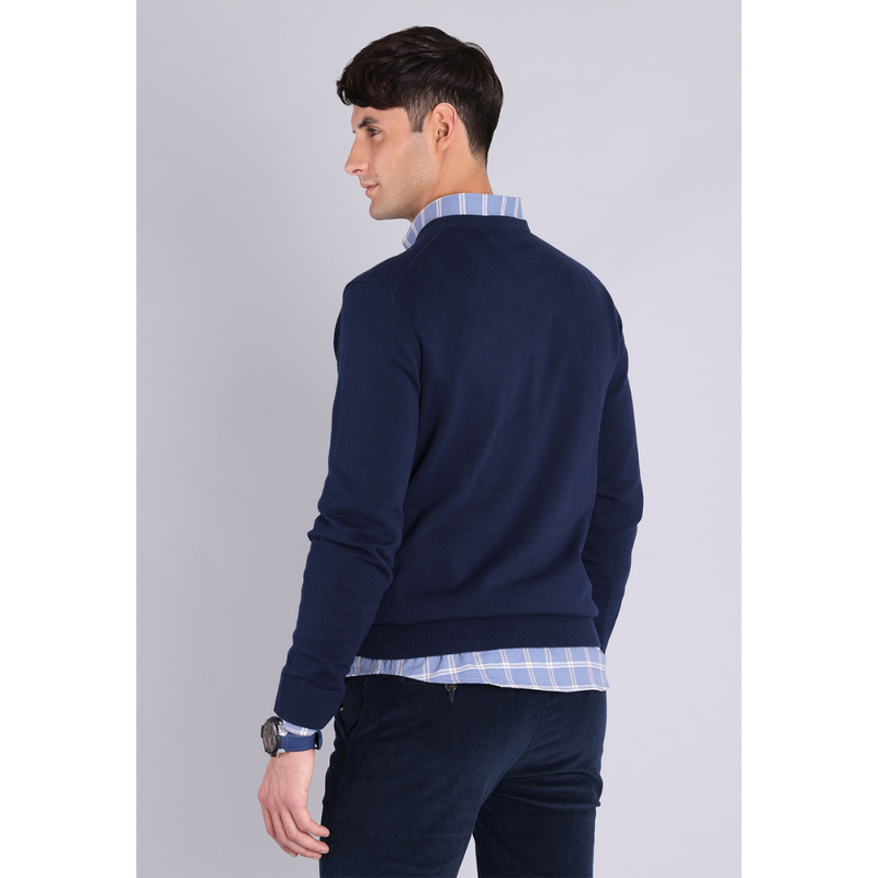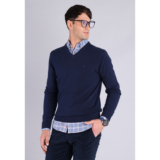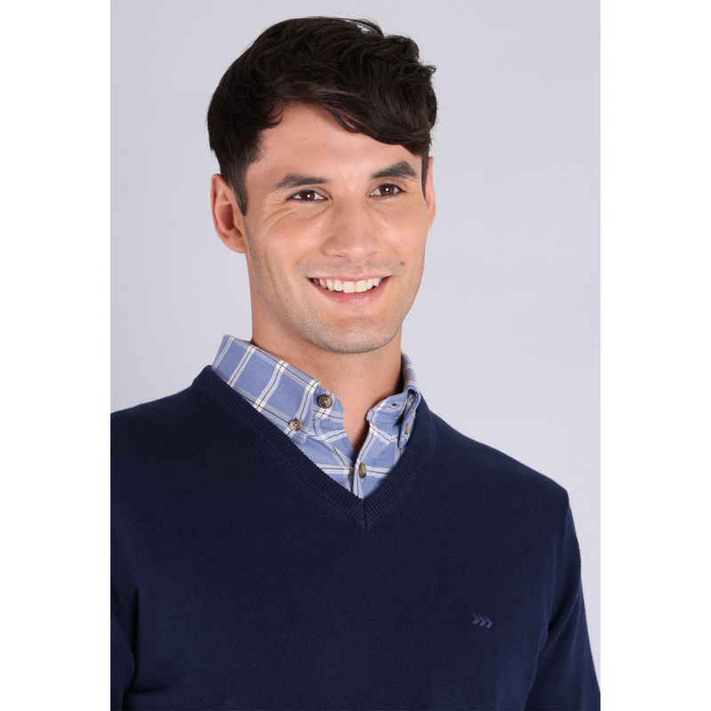 Sweater diseño liso, manga larga, cuello en V, regular fit, logo bordado a la altura del pecho, cuello-pretina-puños tejido acanalado, 100% algodón.