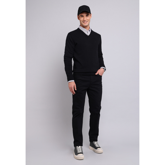 Sweater diseño liso, manga larga, cuello en V, regular fit, logo bordado a la altura del pecho, cuello-pretina-puños tejido acanalado, 100% algodón.